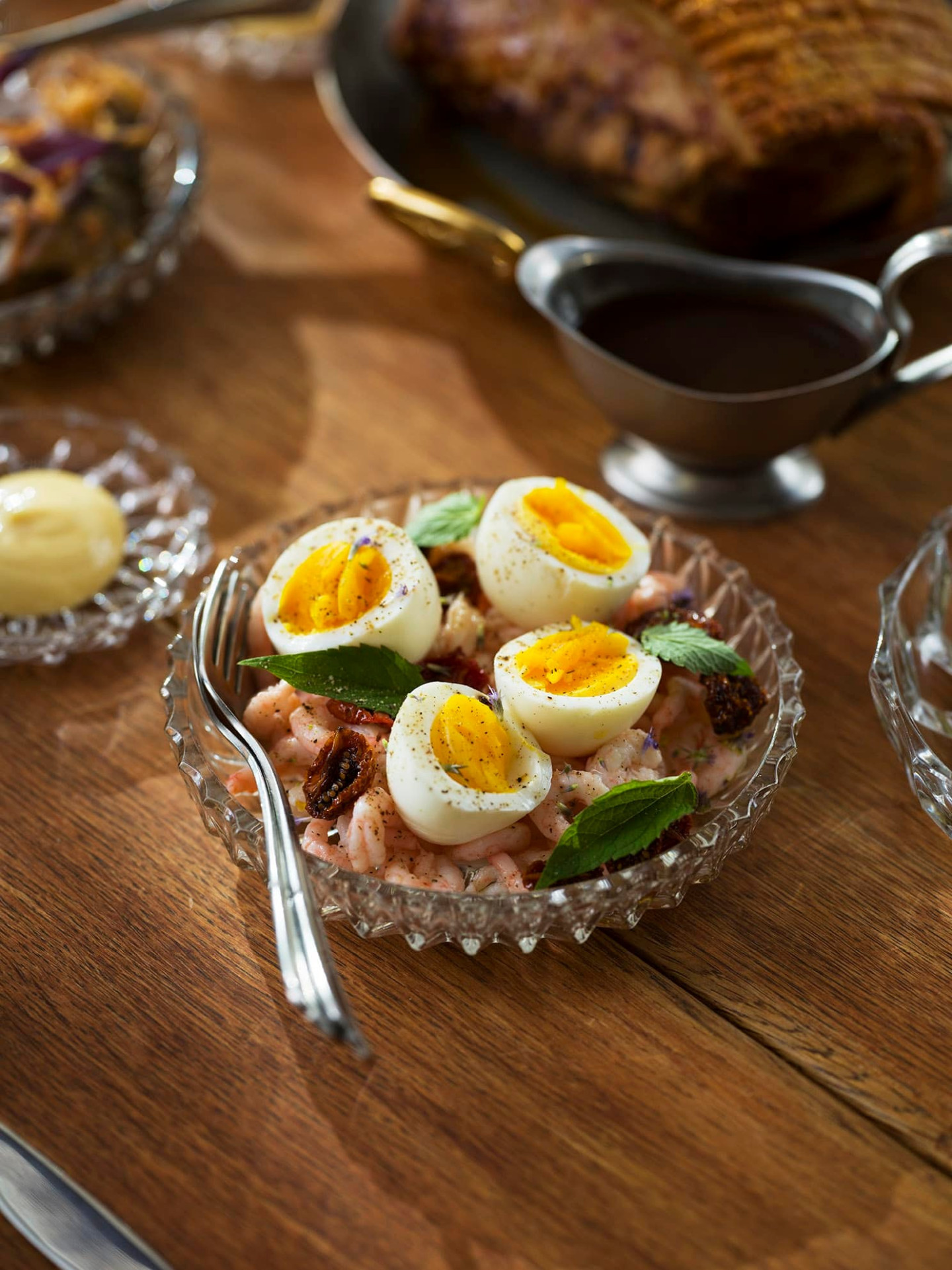 Økologiske æg, håndpillede rejer og kroens hjemmerørte mayonnaise med citron og karse