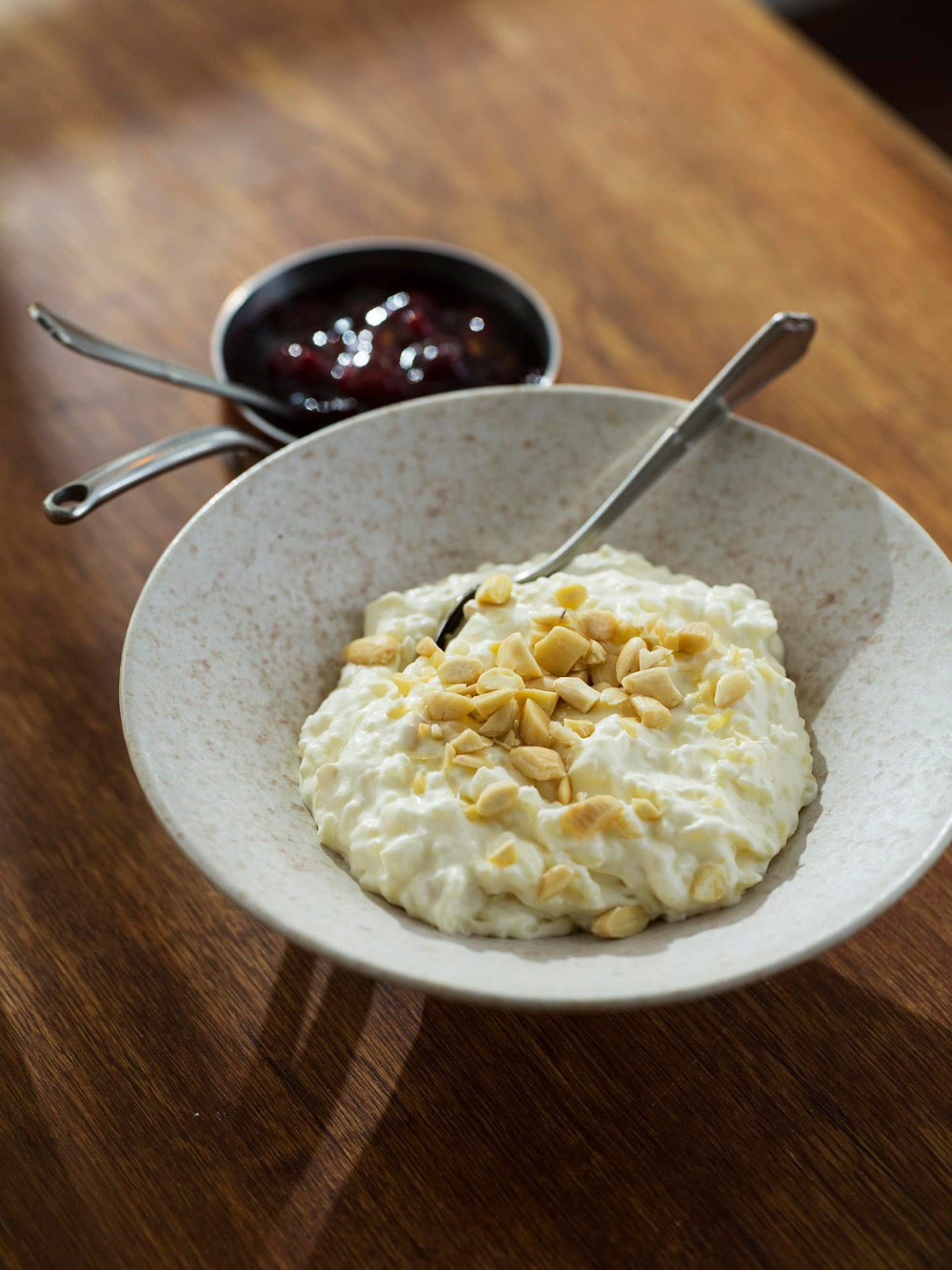 Tilkøb af risalamande med ristede mandler og lun kirsebærsauce